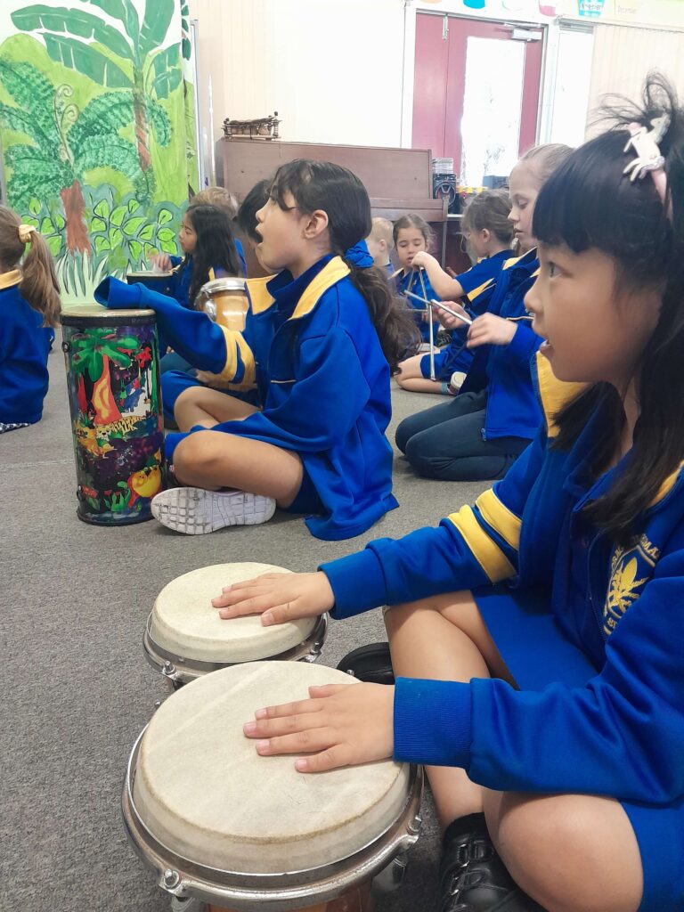 In the early years, students explore music through singing, movement, games, and tuned and untuned percussion instruments. They learn to keep a steady beat, recognise pitch and dynamics, and perform simple pieces in unison and small ensembles. As they progress, students broaden their musical knowledge and skills, progressing to formal musical literacy, including reading and writing music. Ensemble skills are strengthened through rehearsing and performing on a range of percussion instruments, including marimbas.